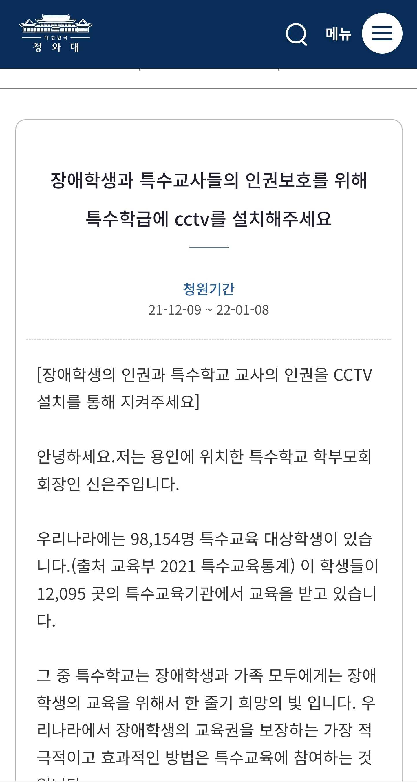장애학생과 특수교사들의 인권보호를 위해 특수학급에 cctv를 설치해주세요 > 대한민국 청와대